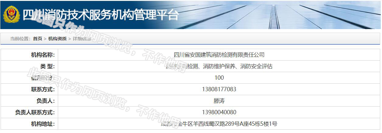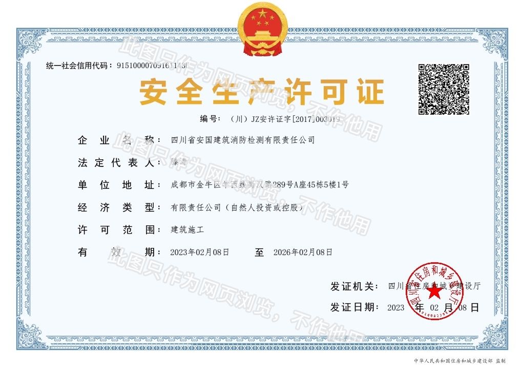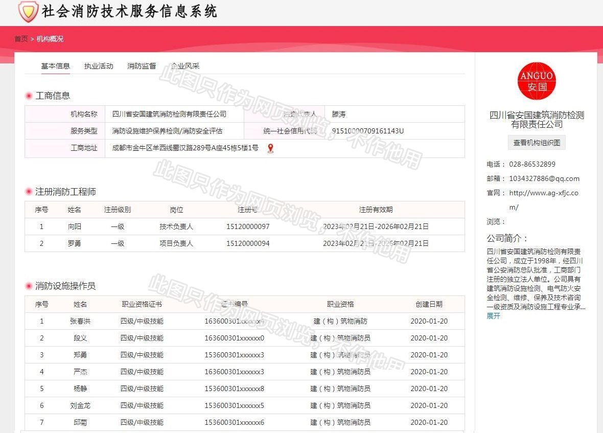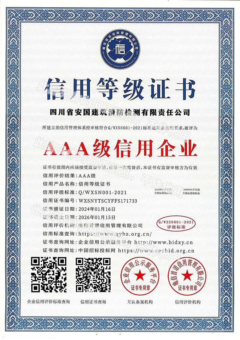 四川省安國建筑消防檢測有限責(zé)任公司,成立于1998年,經(jīng)四川省公安消防總隊批準(zhǔn),工商部門注冊的獨立法人單位。 公司具有建筑消防設(shè)施檢測、電氣防火安全檢測、維修、保養(yǎng)及技術(shù)咨詢一級資質(zhì)的中介技術(shù)服務(wù)機(jī)構(gòu),獲得CMA計量認(rèn)證。主要業(yè)務(wù)范圍是:接受建設(shè)單位或有關(guān)單位委托,承擔(dān)新建、改建、擴(kuò)建建筑自動消防設(shè)施技術(shù)檢測、電氣防火安全檢測、以及承接建筑消防設(shè)施維護(hù)保養(yǎng),對已交付使用的建設(shè)消防設(shè)施的運行情況進(jìn)行運行檢測,開展建筑消防設(shè)施的消防安全技術(shù)咨詢。公司設(shè)辦公室、總工辦、財務(wù)部、檢測部、維保部等職能機(jī)構(gòu),擁有一